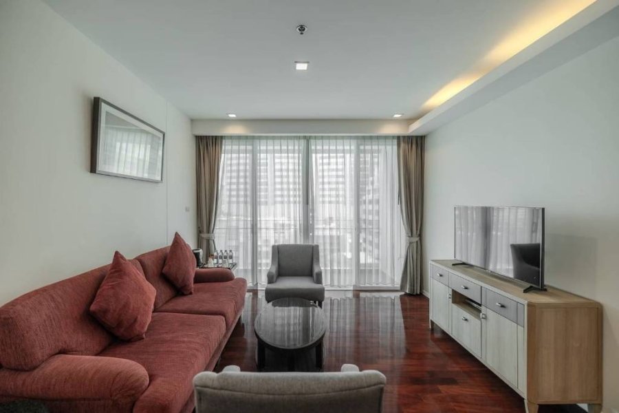 Inviting pet friendly 2 bedroom apartment for rent in Asoke is situated on a middle floor level of the building with a spacious balcony. Fully furnished luxury 2 bedroom at GM Serviced Apartment for rent has 2 bathrooms and a generous 95 SQM of usable living area.