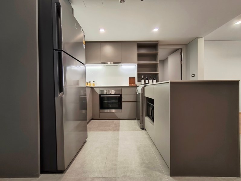 The open European kitchen features a refrigerator, built-in oven, microwave, 5 plate electric-stove with extractor fan, dishwasher and a separate washing and drying machine.