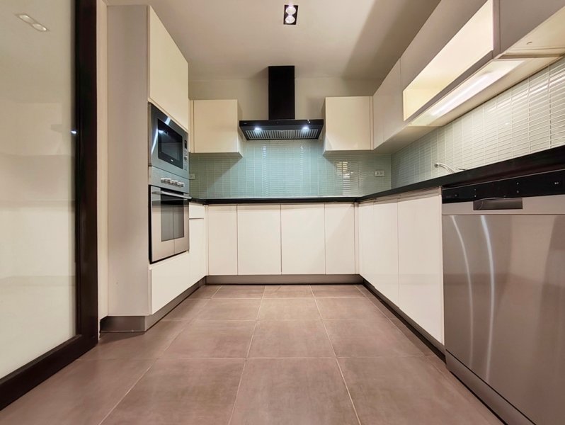 The European kitchen features a double-door refrigerator, separate built-in oven and built-in microwave, dishwasher, 4 plate electric-stove with extractor fan and a washer/dryer machine combo.
