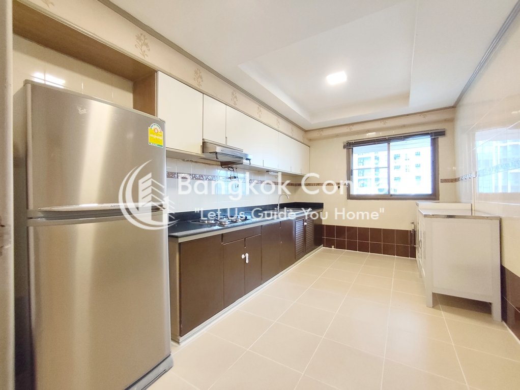 Description: Fully furnished 3 bedroom near The American School of Bangkok (ASB) has 3 ensuite bathroom, guest toilet, storage room, maid’s quarters and a generous 280 SQM of usable living area. The European kitchen features a refrigerator, microwave, 1 plate electric-stove + 3 plate gas-stove with extractor fan and a washing machine.