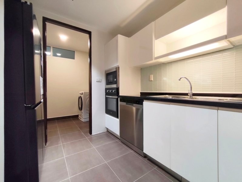 The European kitchen features a double-door refrigerator, separate built-in oven and built-in microwave, dishwasher, 4 plate electric-stove with extractor fan and a washer/dryer machine combo.
