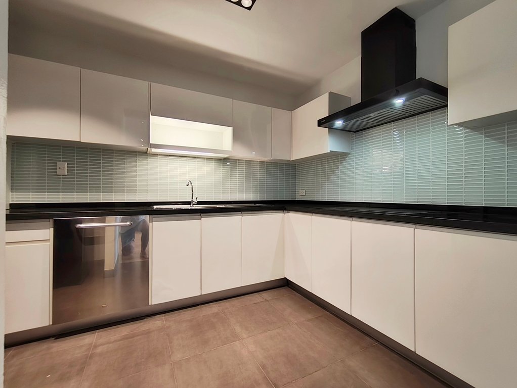 The European kitchen features a double-door refrigerator, separate built-in oven and built-in microwave, dishwasher, 4 plate electric-stove with extractor fan and a washer/dryer machine combo.