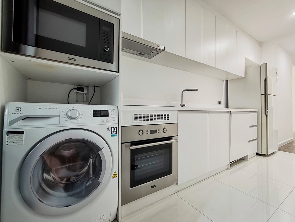 The European kitchen features arefrigerator, separate built-in oven and built-in microwave, 4 plate electric-stove with extractor fan, dishwasher and a washer/dryer machine combo.