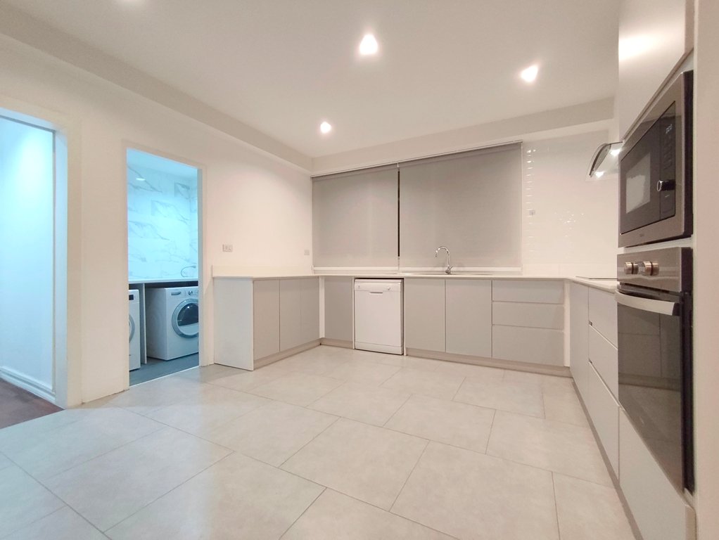 The open European kitchen features a double-door refrigerator, separate built-in oven and built-in microwave, 4 plate electric-stove with extractor fan, dishwasher as well as a separate washing and drying machine.